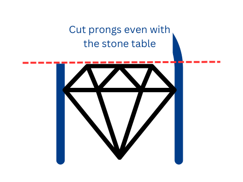 For the prongs, my Sensei shared a helpful rule of thumb: cut them to the height of the stone’s table. From there, you can sculpt, refine, and finally set the stone into place.