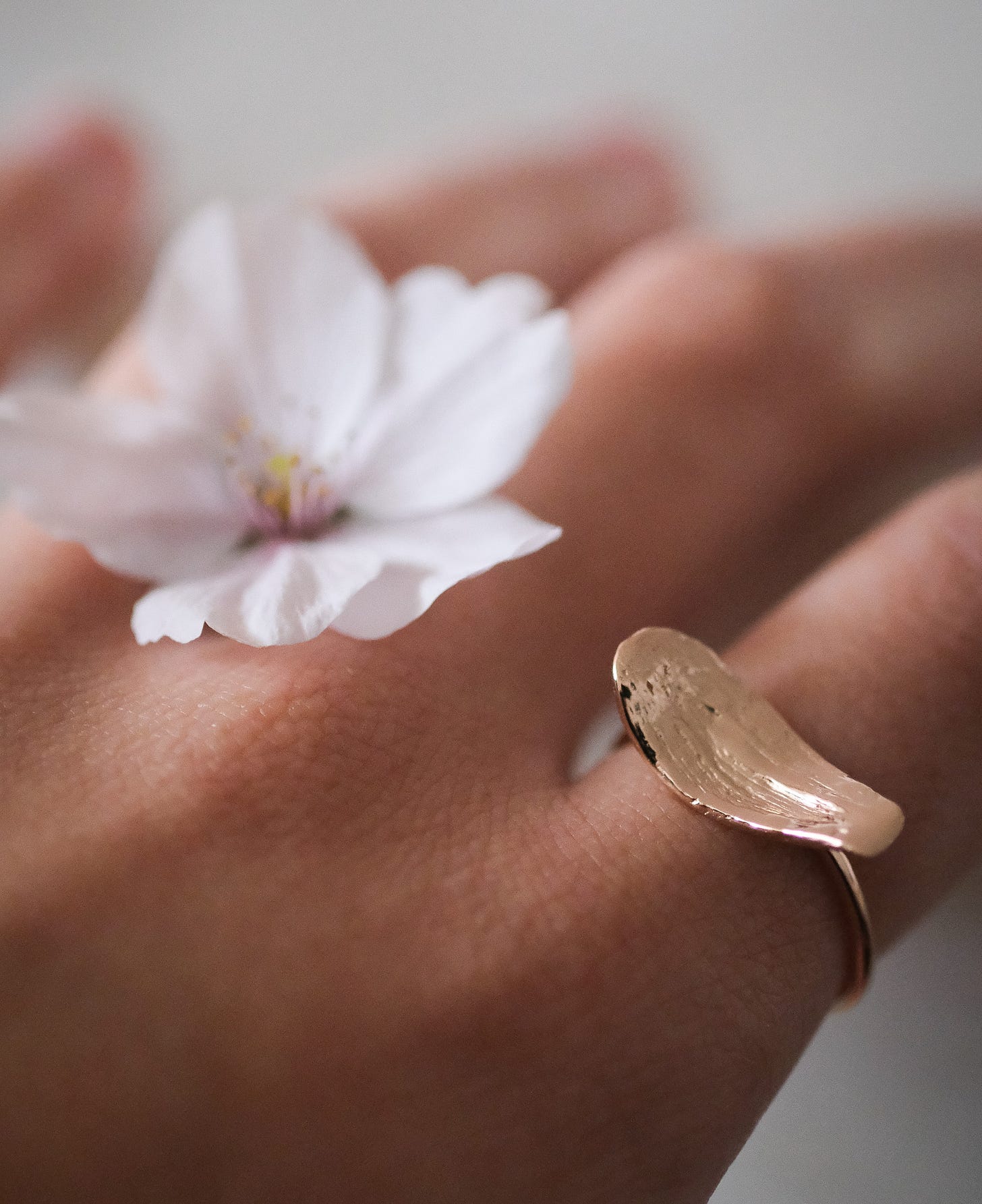 I was inspired by the petals on the river to capture the moment between life on a tree and disintegration. Cast in solid k18 rose gold, the textured pink petal floats on a thin band. The ring holds nostalgia for me of seasons past and anticipation for springs to come.