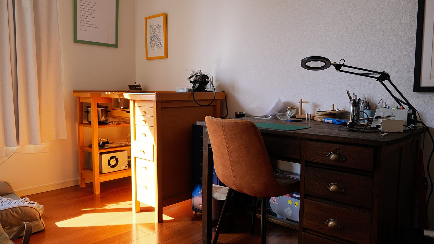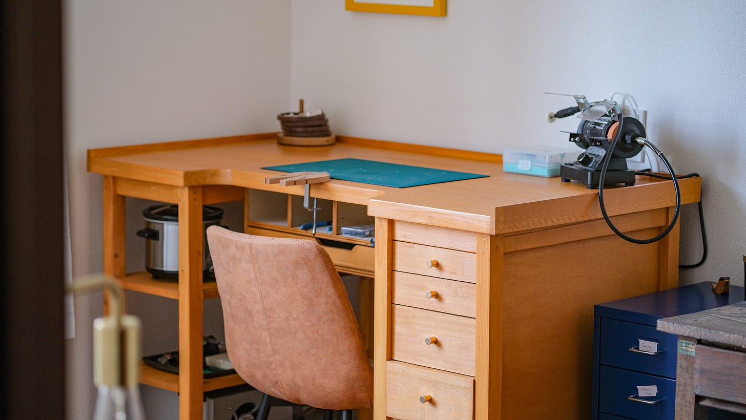 The workbench is quite tall (90 cm) to reduce hunching as I work and has built-in drawers on the right and open shelves on the left for larger tools. It also has a thin drawer in the center like a real jeweler’s bench to catch metal shavings.