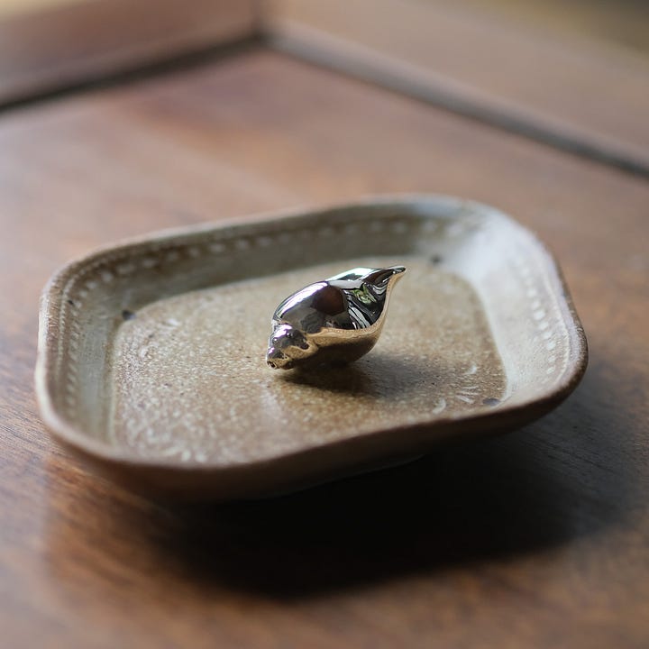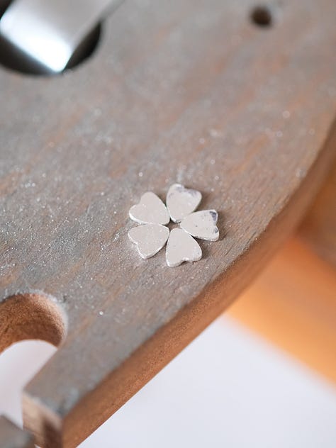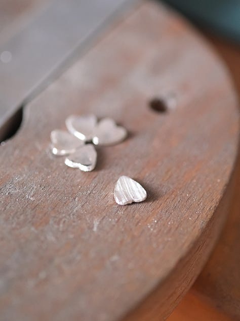 If you recall, last week I discussed wanting to explore ways to reflect unexpected beauty and imperfection through jewelry. I tried the concept initially as a clover which didn’t quite feel interesting enough, and this week I revisited a theme I touched on last spring: the beauty of a fallen sakura petal. I fabricated a version in silver that resonates with me; in a final version, the fallen petal made using mitsuro (traditional Japanese wax) would be in yellow gold while the rest remains platinum or silver.