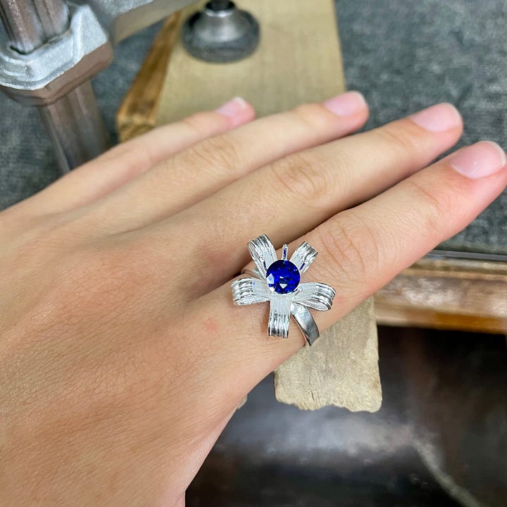 I persevered through a real test of my patience and soldering ability to progress my sapphire flower ring. At first, I accidentally secured the stone seat a bit off-center in the flower, which ended up being a good experience to understand how to recover/fix a mistake (it involved a lot of heat and a very quick reaction from my Sensei to melt the solder and snatch the basket seat away before it all completely melted!). All that’s left is a final polish and refinement of the stone setting. I want my next project at school to make a very classic engagement ring-looking setting as that is probably a good skill to have!