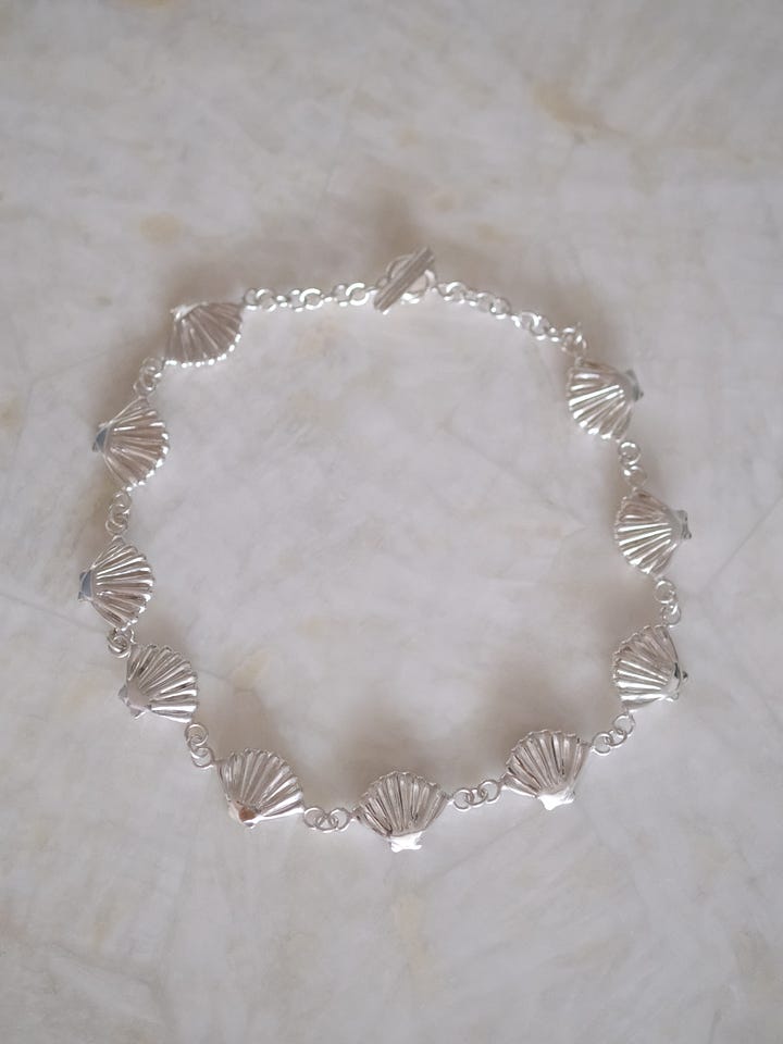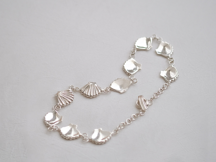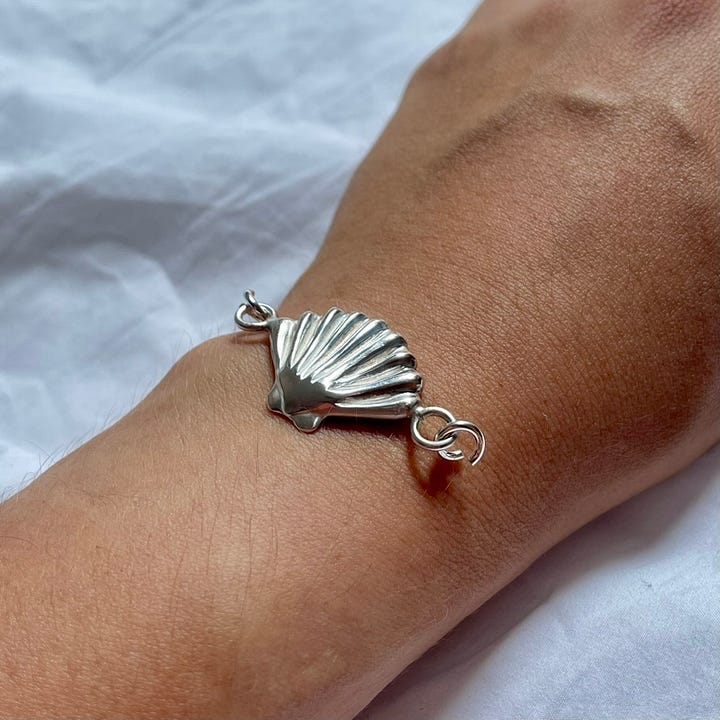 The necklace was something I worked on in scattered moments over the course of a couple of months. It started with a single shell, carved out of hard green wax, which I then cast into sterling silver. From there, the idea grew from the originally planned bracelet to the current necklace. I soldered jump rings along the piece so the individual shells could link together, forming a fluid chain of charms. Each stage felt like a puzzle, and I loved watching the design slowly come alive.