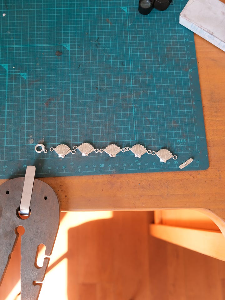 I’ve been soldering and polishing in every spare moment, and if all goes well it should be finished by next week. I can’t wait to share it. I really love the way it looks when worn!