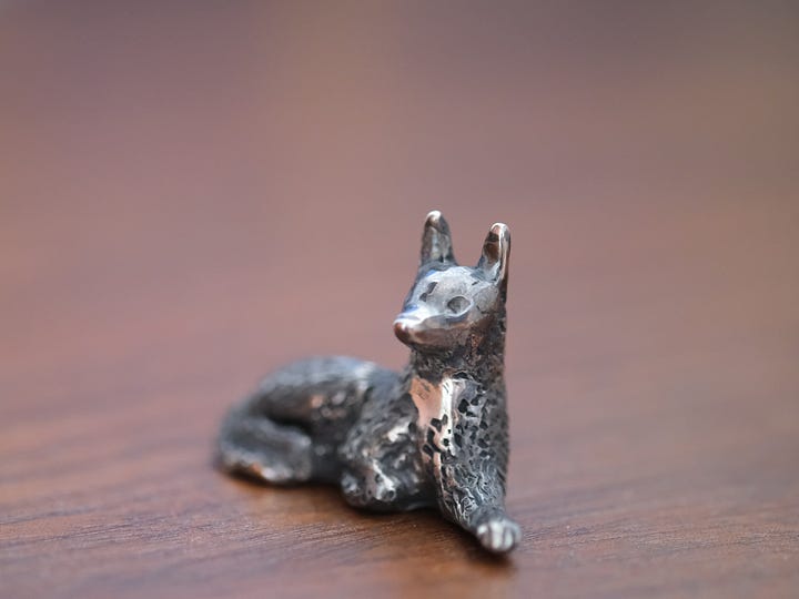 Speaking of silver tarnish, for this project I used it to enhance the design. To mimic Umi’s fur I applied an oxidation liquid to darken most of the figurine. If you look closely, you’ll notice texture for her fur. I made this texture directly in wax, which gave the surface a softer, more abstract feel. Another approach could have been to add the fur details after casting with a rotary bur, which would have resulted in a sharper, more defined look.