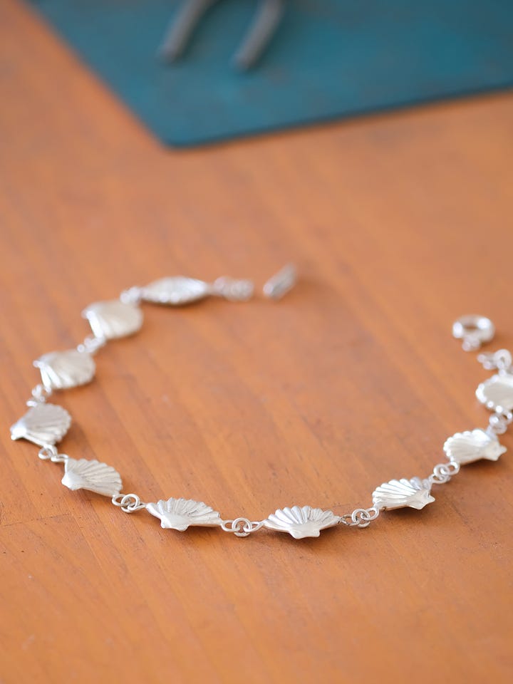 At long last, my shell charms are literally coming together. What began as a modest idea for a three-charm bracelet grew to five, and this past week I decided to go all in: a chunky silver necklace with ten charms and a toggle clasp.