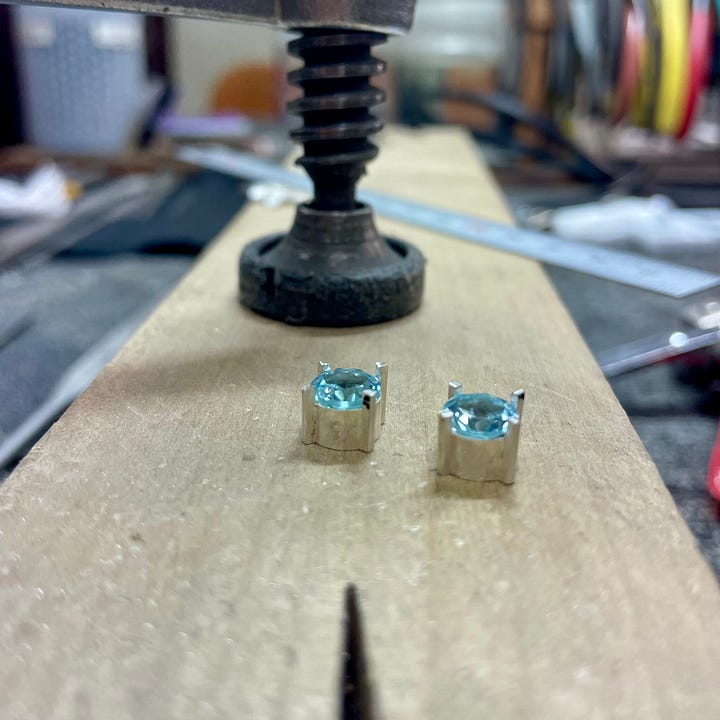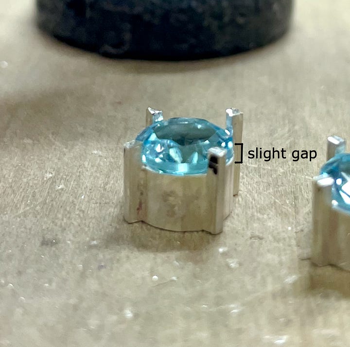 In school, I am working on a pair of fabricated earrings with a prong-on-bezel setting. My Sensei (who is seriously fantastic and so knowledgeable) explained to me that when you look at high jewelry with this setting, you will often see a slight gap between the girdle of the stone and the top of the bezel. Initially you might assume that this is a mistake or misfit, but actually it is intentional. The gap allows more light in through to the stone and creates more sparkle.