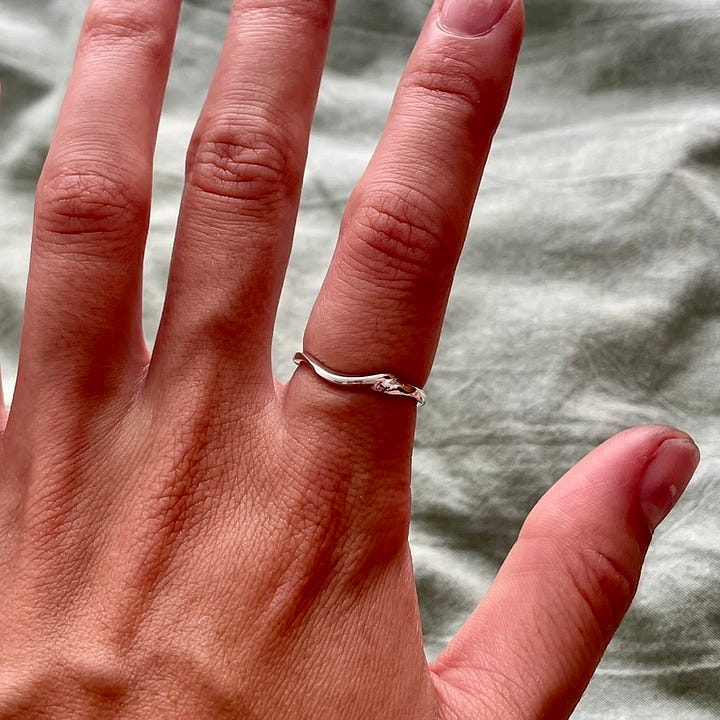 From the start, my goal was to sculpt delicate bands that could be stacked together or worn alone. The inspiration came from the river near my home, where currents often run side by side yet twist in opposite directions. By pairing two minimalist bands, I hoped to subtly suggest water flowing around stones.